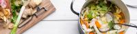 Lägg kycklingbrösten i en gryta, häll över vattnet och låt koka upp. Sänk värmen och låt sjuda. Tillsätt lök, vitlök, ingefära, peppar och salt. Fortsätt att sjuda i 20 minuter, eller tills kycklingen är mör och genomkokt. Lyft ur kycklingen, de halverade lökarna och vitlöken. Lägg kycklingen åt sidan.Lägg selleri, purjolök och lök i buljongen. Koka upp, tillsätt nudlarna och koka enligt förpackningens anvisningar. Dela och strimla kycklingen under tiden, lägg tillbaka i grytan tillsammans med moroten och fortsätt koka under ungefär en minut. Smaka av med salt och peppar, garnera med hackad färsk koriander.