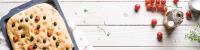 Lös sockret i hälften av det ljumma vattnet. Gör en hög av mjöl och salt på en ren arbetsyta eller i en stor skål. Gör en grop i mitten och häll i all upplöst jäst. Lägg i mer och mer av mjölet i gropen tills all jästblandning har sugits upp. Häll därefter i resten av vattnet i gropen och arbeta stegvis in allt mjöl så att det blir en lös deg.Platta ut, tryck ihop och vik degen om och om igen under 5 minuter. Mjöla händerna och pudra mjöl på degens ovansida. Forma degen till en rund boll och sätt den på en bakplåt. Låt vila och jäsa till dubbel storlek på en varm och dragfri plats. Detta tar cirka 40 minuter. Ta upp den jästa degen och lägg den därefter på ett mjölat bakbord, tryck luften ur den och kavla ut till cirka 2,5 cm tjocklek. Lägg över degen på en mjölad bakplåt och tryck ut den så att den fyller plåten. Häll över olivolja och tryck ned tomater och oliver, strö över rosmarin.Tryck därefter fingrarna genom degen ned till plåtens botten med jämna mellanrum. Detta ger brödet sin klassiska form och i fördjupningarna kommer det att samlas olivolja medan brödet gräddas. Låt jäsa till dubbel storlek igen och strö därefter salt och peppar över. Sätt försiktigt in i en förvärmd ugn, 220 °C. Grädda i 20 minuter, tills brödet har fått en gyllenbrun skorpa men är mjukt i mitten.