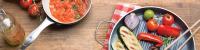 Skiva auberginerna på längden, strö över salt och låt stå och dra i en timme. Skölj väl och klappa torrt. Skiva löken till ringar. Halvera tomaterna och gröp ur fröna. Skär tomatköttet i bitar. Skala vitlöksklyftorna och krossa dem. Hetta upp 2 msk olivolja i en kastrull och stek lök och vitlök i 7 minuter tills de är mjuka. Tillsätt tomater, lagerblad, rosmarinkvistar, basilika, peppar och salt, låt koka i 15 minuter, höj värmen så att eventuellt vätskeöverskott avdunstar. Ta av från värmen och låt svalna något. Skär paprikan på längden i fyra delar, avlägsna fröna.Skär varje zucchini på längden i fina skivor, kasta de yttre skivorna. Pensla aubergine, paprika och zucchini med olivolja och grilla i grillpannan tills de är klara och har fått ränder. Varva aubergine, paprika och därefter tomatröra, mer paprika, aubergine och zucchini, avsluta med tomatröra, lite smulad getost, en rosmarinkvist och basilikablad. Serveras varm eller kall.