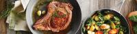 将烤箱预热至 200°C。牛排刷上油,撒上新鲜香草、盐和胡椒。将大号煎锅用中大火加热。放入 2 瓣蒜头。牛排每边煎 3-4 分钟。移至烤箱烘烤,15 分钟后五分熟时翻边。用铝箔宽松地盖住牛排,放在一边,静置约 5 分钟。