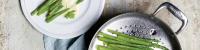 Για τη σως: Λιώστε το βούτυρο. Φτιάξτε βούτυρο κλαριφιέ αφαιρώντας τον αφρό που σχηματίζεται στην επιφάνεια και ρίχνοντας το λιωμένο βούτυρο αργά σε ένα μπολ προσέχοντας να μην ρίξετε μέσα και το λευκό υπόλειμμα στον πάτο (τον ορό γάλακτος). Απομακρύνετε από την εστία και προσθέστε σταδιακά το βούτυρο κλαριφιέ. Σε ένα κατσαρολάκι, χτυπήστε με σύρμα τους κρόκους με το νερό σε πολύ χαμηλή θερμοκρασία, μέχρι τους 50 με 55 °C. Οι κρόκοι πρέπει να έχουν αφρώδη υφή. Προσθέστε τον χυμό λεμονιού και αλάτι. Γεμίστε την κατσαρόλα με 3 λίτρα νερού και αφήστε να πάρει βράση. Μαγειρέψτε στον ατμό τα σπαράγγια μέσα στο καλαθάκι ατμού για περίπου 10 με 15 λεπτά. Ελέγξτε αν τα σπαράγγια είναι έτοιμα τρυπώντας τα με την άκρη ενός μαχαιριού. Πρέπει να είναι τρυφερά. Σερβίρετέ τα ζεστά με τη σως Ολαντέζ.