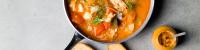 Faites chauffer un filet d’huile d’olive dans une poêle à frire. Faites sauter l’oignon et l’ail jusqu’à ce qu’ils soient transparents. Ajoutez le fenouil et faites-le braiser pendant quelques minutes, puis ajoutez le poireau et les tomates. Ajoutez la purée de tomates aux légumes. Faites cuire encore quelques minutes en mélangeant souvent. Saupoudrez la farine sur les légumes sautés, mélangez brièvement et faites flamber avec un filet de pastis.Attention ! Ne faites jamais flamber un plat avec la hotte aspirante allumée !Versez le bouillon de poisson dans la poêle. Ajoutez le thym, les feuilles de laurier et les pistils de safran. Faites mijoter pendant 45 minutes à feu doux. Coupez le poisson en petits morceaux.Déveinez les gambas en faisant une incision le long du dos et en retirant l’intestin. Ajoutez le poisson et les gambas dans la poêle et pochez-les pendant quelques minutes. Salez et poivrez. Servez la bouillabaisse avec du pain à l’ail chaud et croustillant et de la rouille. Garnissez de fanes de fenouil.Rouille : écrasez l’ail et incorporez les jaunes d’œuf. Ajoutez lentement la moitié de l’huile en mélangeant constamment. Ajoutez le bouillon de bouillabaisse et une cuillère à soupe de vinaigre. Ajoutez très lentement le reste d’huile tout en continuant à mélanger. Assaisonnez avec le sel, le jus de citron et le piment de Cayenne. Incorporez la purée de tomates et terminez avec le safran.