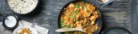 Heat the olive oil over medium-high in a large skillet. Add the sweet potato and cook for 5 minutes, until the sweet potato begins to brown. Lower the heat to medium and add the red pepper, curry, cumin, cinnamon, fennel seed, and ginger and cook for 2 minutes. Add the cauliflower, onion, broth, garbanzos, tomato, tomato sauce and salt. Cover and simmer for 10 minutes until the vegetables are just tender. Uncover, add peas, and continue simmering for 5 more minutes to allow the sauce to thicken. Serve the curry over rice, top with a dollop of yogurt and some cilantro.